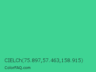 CIELCh 75.897,57.463,158.915 Color is a normal green color and the nearest color is Shamrock #33cc99. Hex code #3ed393 and RGB value is rgb(62,211,147). In RGB color space, this color is composed of 24% red, 83% green, 58% blue, In CMYK color space, this color is composed of 71% cyan, 0% magenta, 30% yellow , 17% black , In HSL color space, this color has a hue angle of 154° , 63% saturation and 54% lightness.