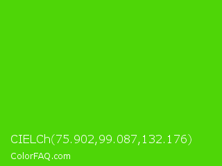 CIELCh 75.902,99.087,132.176 Color is a normal green color and the nearest color is Harlequin Green #46cb18. Hex code #4ed607 and RGB value is rgb(78,214,7). In RGB color space, this color is composed of 31% red, 84% green, 3% blue, In CMYK color space, this color is composed of 64% cyan, 0% magenta, 97% yellow , 16% black , In HSL color space, this color has a hue angle of 99° , 94% saturation and 43% lightness.