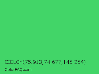 CIELCh 75.913,74.677,145.254 Color is a normal green color and the nearest color is UFO Green #3cd070. Hex code #42d568 and RGB value is rgb(66,213,104). In RGB color space, this color is composed of 26% red, 84% green, 41% blue, In CMYK color space, this color is composed of 69% cyan, 0% magenta, 51% yellow , 16% black , In HSL color space, this color has a hue angle of 136° , 64% saturation and 55% lightness.