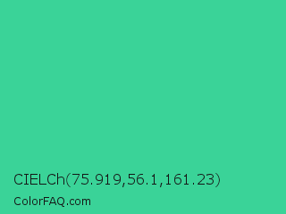 CIELCh 75.919,56.1,161.23 Color is a normal green color and the nearest color is Shamrock #33cc99. Hex code #3ad398 and RGB value is rgb(58,211,152). In RGB color space, this color is composed of 23% red, 83% green, 60% blue, In CMYK color space, this color is composed of 73% cyan, 0% magenta, 28% yellow , 17% black , In HSL color space, this color has a hue angle of 157° , 63% saturation and 53% lightness.