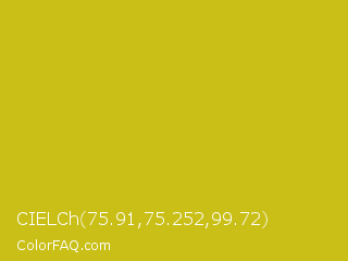 CIELCh 75.91,75.252,99.72 Color is a normal yellow color and the nearest color is Key Lime Pie #bfc921. Hex code #c9bf17 and RGB value is rgb(201,191,23). In RGB color space, this color is composed of 79% red, 75% green, 9% blue, In CMYK color space, this color is composed of 0% cyan, 5% magenta, 89% yellow , 21% black , In HSL color space, this color has a hue angle of 57° , 79% saturation and 44% lightness.
