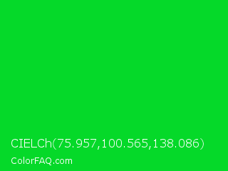 CIELCh 75.957,100.565,138.086 Color is a normal green color and the nearest color is Vivid Malachite #00cc33. Hex code #05d929 and RGB value is rgb(5,217,41). In RGB color space, this color is composed of 2% red, 85% green, 16% blue, In CMYK color space, this color is composed of 98% cyan, 0% magenta, 81% yellow , 15% black , In HSL color space, this color has a hue angle of 130° , 95% saturation and 44% lightness.