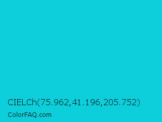 CIELCh 75.962,41.196,205.752 Color is a normal cyan color and the nearest color is Dark Turquoise #00ced1. Hex code #0dcfdb and RGB value is rgb(13,207,219). In RGB color space, this color is composed of 5% red, 81% green, 86% blue, In CMYK color space, this color is composed of 94% cyan, 5% magenta, 0% yellow , 14% black , In HSL color space, this color has a hue angle of 183° , 89% saturation and 45% lightness.