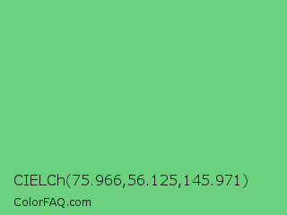 CIELCh 75.966,56.125,145.971 Color is a light green color and the nearest color is Pastel Green #77dd77. Hex code #6cd07f and RGB value is rgb(108,208,127). In RGB color space, this color is composed of 42% red, 82% green, 50% blue, In CMYK color space, this color is composed of 48% cyan, 0% magenta, 39% yellow , 18% black , In HSL color space, this color has a hue angle of 131° , 52% saturation and 62% lightness.