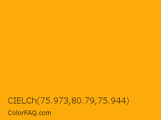 CIELCh 75.973,80.79,75.944 Color is a normal orange color and the nearest color is Yellow Sea #fea904. Hex code #fcab0a and RGB value is rgb(252,171,10). In RGB color space, this color is composed of 99% red, 67% green, 4% blue, In CMYK color space, this color is composed of 0% cyan, 32% magenta, 96% yellow , 1% black , In HSL color space, this color has a hue angle of 40° , 98% saturation and 51% lightness.