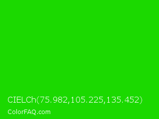 CIELCh 75.982,105.225,135.452 Color is a normal green color and the nearest color is Green #00ff00. Hex code #1bd900 and RGB value is rgb(27,217,0). In RGB color space, this color is composed of 11% red, 85% green, 0% blue, In CMYK color space, this color is composed of 88% cyan, 0% magenta, 100% yellow , 15% black , In HSL color space, this color has a hue angle of 113° , 100% saturation and 43% lightness.
