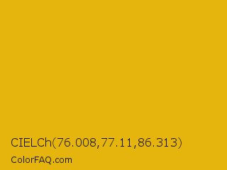 CIELCh 76.008,77.11,86.313 Color is a normal yellow color and the nearest color is Galliano #dcb20c. Hex code #e6b50d and RGB value is rgb(230,181,13). In RGB color space, this color is composed of 90% red, 71% green, 5% blue, In CMYK color space, this color is composed of 0% cyan, 21% magenta, 94% yellow , 10% black , In HSL color space, this color has a hue angle of 46° , 89% saturation and 48% lightness.
