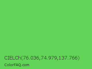 CIELCh 76.036,74.979,137.766 Color is a normal green color and the nearest color is Mantis #74c365. Hex code #63d358 and RGB value is rgb(99,211,88). In RGB color space, this color is composed of 39% red, 83% green, 35% blue, In CMYK color space, this color is composed of 53% cyan, 0% magenta, 58% yellow , 17% black , In HSL color space, this color has a hue angle of 115° , 58% saturation and 59% lightness.