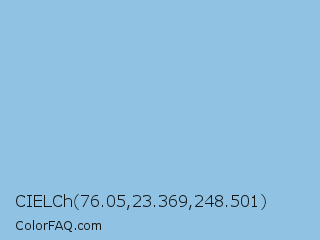 CIELCh 76.05,23.369,248.501 Color is a light blue color and the nearest color is Pale Cerulean #9bc4e2. Hex code #8fc2e3 and RGB value is rgb(143,194,227). In RGB color space, this color is composed of 56% red, 76% green, 89% blue, In CMYK color space, this color is composed of 37% cyan, 15% magenta, 0% yellow , 11% black , In HSL color space, this color has a hue angle of 204° , 60% saturation and 73% lightness.