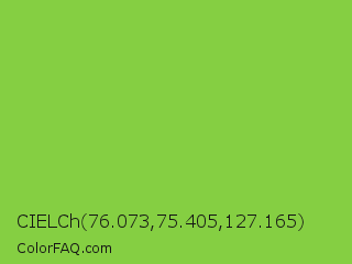 CIELCh 76.073,75.405,127.165 Color is a normal green color and the nearest color is Kiwi #8ee53f. Hex code #85cf42 and RGB value is rgb(133,207,66). In RGB color space, this color is composed of 52% red, 81% green, 26% blue, In CMYK color space, this color is composed of 36% cyan, 0% magenta, 68% yellow , 19% black , In HSL color space, this color has a hue angle of 91° , 59% saturation and 54% lightness.