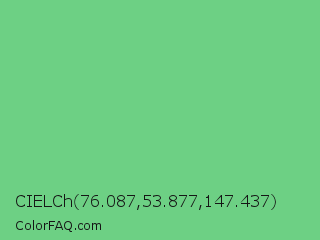 CIELCh 76.087,53.877,147.437 Color is a light green color and the nearest color is De York #7ac488. Hex code #6dd084 and RGB value is rgb(109,208,132). In RGB color space, this color is composed of 43% red, 82% green, 52% blue, In CMYK color space, this color is composed of 48% cyan, 0% magenta, 37% yellow , 18% black , In HSL color space, this color has a hue angle of 134° , 51% saturation and 62% lightness.