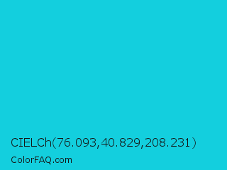 CIELCh 76.093,40.829,208.231 Color is a normal cyan color and the nearest color is Dark Turquoise #00ced1. Hex code #13cfde and RGB value is rgb(19,207,222). In RGB color space, this color is composed of 7% red, 81% green, 87% blue, In CMYK color space, this color is composed of 91% cyan, 7% magenta, 0% yellow , 13% black , In HSL color space, this color has a hue angle of 184° , 84% saturation and 47% lightness.