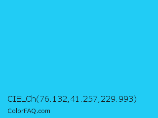 CIELCh 76.132,41.257,229.993 Color is a normal cyan color and the nearest color is Spiro Disco Ball #0fc0fc. Hex code #21ccf5 and RGB value is rgb(33,204,245). In RGB color space, this color is composed of 13% red, 80% green, 96% blue, In CMYK color space, this color is composed of 87% cyan, 17% magenta, 0% yellow , 4% black , In HSL color space, this color has a hue angle of 192° , 91% saturation and 55% lightness.