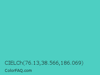 CIELCh 76.13,38.566,186.069 Color is a normal cyan color and the nearest color is Medium Turquoise #48d1cc. Hex code #4dcfc2 and RGB value is rgb(77,207,194). In RGB color space, this color is composed of 30% red, 81% green, 76% blue, In CMYK color space, this color is composed of 63% cyan, 0% magenta, 6% yellow , 19% black , In HSL color space, this color has a hue angle of 174° , 58% saturation and 56% lightness.