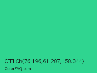 CIELCh 76.196,61.287,158.344 Color is a normal green color and the nearest color is Shamrock #33cc99. Hex code #2fd590 and RGB value is rgb(47,213,144). In RGB color space, this color is composed of 18% red, 84% green, 56% blue, In CMYK color space, this color is composed of 78% cyan, 0% magenta, 32% yellow , 16% black , In HSL color space, this color has a hue angle of 155° , 66% saturation and 51% lightness.