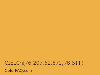 CIELCh 76.207,62.871,78.511 Color is a normal orange color and the nearest color is Maximum Yellow Red #f2ba49. Hex code #efb145 and RGB value is rgb(239,177,69). In RGB color space, this color is composed of 94% red, 69% green, 27% blue, In CMYK color space, this color is composed of 0% cyan, 26% magenta, 71% yellow , 6% black , In HSL color space, this color has a hue angle of 38° , 84% saturation and 60% lightness.