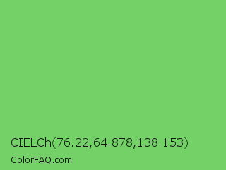 CIELCh 76.22,64.878,138.153 Color is a light green color and the nearest color is Mantis #74c365. Hex code #73d168 and RGB value is rgb(115,209,104). In RGB color space, this color is composed of 45% red, 82% green, 41% blue, In CMYK color space, this color is composed of 45% cyan, 0% magenta, 50% yellow , 18% black , In HSL color space, this color has a hue angle of 114° , 53% saturation and 61% lightness.