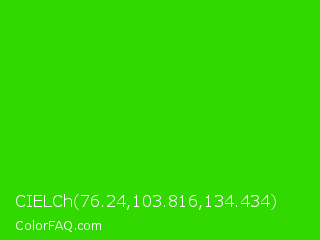 CIELCh 76.24,103.816,134.434 Color is a normal green color and the nearest color is Harlequin Green #46cb18. Hex code #31d900 and RGB value is rgb(49,217,0). In RGB color space, this color is composed of 19% red, 85% green, 0% blue, In CMYK color space, this color is composed of 77% cyan, 0% magenta, 100% yellow , 15% black , In HSL color space, this color has a hue angle of 106° , 100% saturation and 43% lightness.
