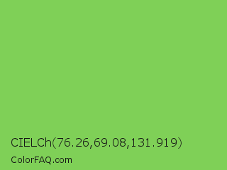 CIELCh 76.26,69.08,131.919 Color is a normal green color and the nearest color is Mantis #74c365. Hex code #7fd057 and RGB value is rgb(127,208,87). In RGB color space, this color is composed of 50% red, 82% green, 34% blue, In CMYK color space, this color is composed of 39% cyan, 0% magenta, 58% yellow , 18% black , In HSL color space, this color has a hue angle of 100° , 56% saturation and 58% lightness.