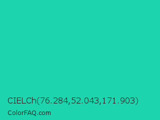 CIELCh 76.284,52.043,171.903 Color is a normal cyan color and the nearest color is Java #1fc2c2. Hex code #1cd4ad and RGB value is rgb(28,212,173). In RGB color space, this color is composed of 11% red, 83% green, 68% blue, In CMYK color space, this color is composed of 87% cyan, 0% magenta, 18% yellow , 17% black , In HSL color space, this color has a hue angle of 167° , 77% saturation and 47% lightness.