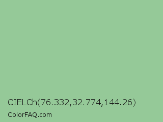 CIELCh 76.332,32.774,144.26 Color is a light green color and the nearest color is Eton Blue #96c8a2. Hex code #95c998 and RGB value is rgb(149,201,152). In RGB color space, this color is composed of 58% red, 79% green, 60% blue, In CMYK color space, this color is composed of 26% cyan, 0% magenta, 24% yellow , 21% black , In HSL color space, this color has a hue angle of 123° , 33% saturation and 69% lightness.