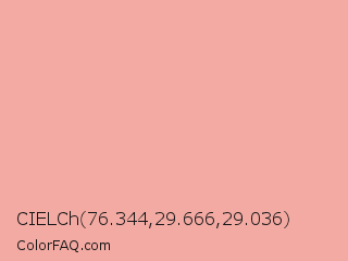 CIELCh 76.344,29.666,29.036 Color is a light red color and the nearest color is Rose Bud #fbb2a3. Hex code #f3aaa3 and RGB value is rgb(243,170,163). In RGB color space, this color is composed of 95% red, 67% green, 64% blue, In CMYK color space, this color is composed of 0% cyan, 30% magenta, 33% yellow , 5% black , In HSL color space, this color has a hue angle of 5° , 77% saturation and 80% lightness.