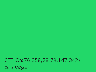 CIELCh 76.358,78.79,147.342 Color is a normal green color and the nearest color is UFO Green #3cd070. Hex code #22d869 and RGB value is rgb(34,216,105). In RGB color space, this color is composed of 13% red, 85% green, 41% blue, In CMYK color space, this color is composed of 84% cyan, 0% magenta, 51% yellow , 15% black , In HSL color space, this color has a hue angle of 143° , 73% saturation and 49% lightness.