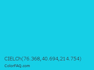 CIELCh 76.368,40.694,214.754 Color is a normal cyan color and the nearest color is Spiro Disco Ball #0fc0fc. Hex code #14cfe6 and RGB value is rgb(20,207,230). In RGB color space, this color is composed of 8% red, 81% green, 90% blue, In CMYK color space, this color is composed of 91% cyan, 10% magenta, 0% yellow , 10% black , In HSL color space, this color has a hue angle of 187° , 84% saturation and 49% lightness.