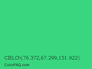 CIELCh 76.372,67.299,151.922 Color is a normal green color and the nearest color is UFO Green #3cd070. Hex code #39d67f and RGB value is rgb(57,214,127). In RGB color space, this color is composed of 22% red, 84% green, 50% blue, In CMYK color space, this color is composed of 73% cyan, 0% magenta, 41% yellow , 16% black , In HSL color space, this color has a hue angle of 147° , 66% saturation and 53% lightness.