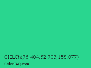 CIELCh 76.404,62.703,158.077 Color is a normal green color and the nearest color is Shamrock #33cc99. Hex code #29d68f and RGB value is rgb(41,214,143). In RGB color space, this color is composed of 16% red, 84% green, 56% blue, In CMYK color space, this color is composed of 81% cyan, 0% magenta, 33% yellow , 16% black , In HSL color space, this color has a hue angle of 155° , 68% saturation and 50% lightness.