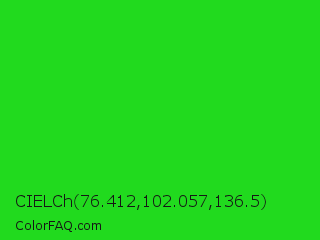 CIELCh 76.412,102.057,136.5 Color is a normal green color and the nearest color is Lime Green #32cd32. Hex code #21da1e and RGB value is rgb(33,218,30). In RGB color space, this color is composed of 13% red, 85% green, 12% blue, In CMYK color space, this color is composed of 85% cyan, 0% magenta, 86% yellow , 15% black , In HSL color space, this color has a hue angle of 119° , 76% saturation and 49% lightness.