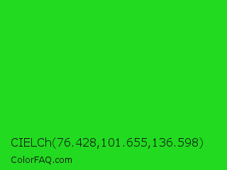 CIELCh 76.428,101.655,136.598 Color is a normal green color and the nearest color is Lime Green #32cd32. Hex code #22da20 and RGB value is rgb(34,218,32). In RGB color space, this color is composed of 13% red, 85% green, 13% blue, In CMYK color space, this color is composed of 84% cyan, 0% magenta, 85% yellow , 15% black , In HSL color space, this color has a hue angle of 119° , 74% saturation and 49% lightness.