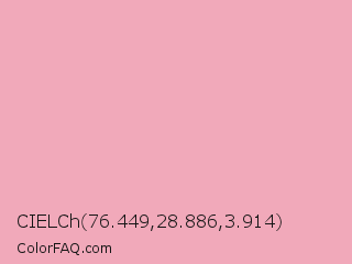 CIELCh 76.449,28.886,3.914 Color is a light red color and the nearest color is Amaranth Pink #f19cbb. Hex code #f1a9ba and RGB value is rgb(241,169,186). In RGB color space, this color is composed of 95% red, 66% green, 73% blue, In CMYK color space, this color is composed of 0% cyan, 30% magenta, 23% yellow , 5% black , In HSL color space, this color has a hue angle of 346° , 72% saturation and 80% lightness.