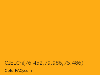 CIELCh 76.452,79.986,75.486 Color is a normal orange color and the nearest color is Sun #fbac13. Hex code #feac14 and RGB value is rgb(254,172,20). In RGB color space, this color is composed of 100% red, 67% green, 8% blue, In CMYK color space, this color is composed of 0% cyan, 32% magenta, 92% yellow , 0% black , In HSL color space, this color has a hue angle of 39° , 99% saturation and 54% lightness.