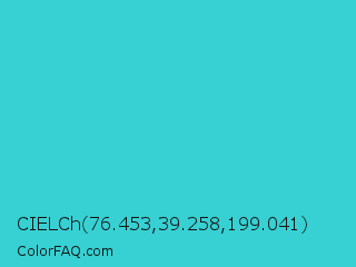 CIELCh 76.453,39.258,199.041 Color is a normal cyan color and the nearest color is Turquoise PWG #30d5c8. Hex code #37d0d3 and RGB value is rgb(55,208,211). In RGB color space, this color is composed of 22% red, 82% green, 83% blue, In CMYK color space, this color is composed of 74% cyan, 1% magenta, 0% yellow , 17% black , In HSL color space, this color has a hue angle of 181° , 64% saturation and 52% lightness.