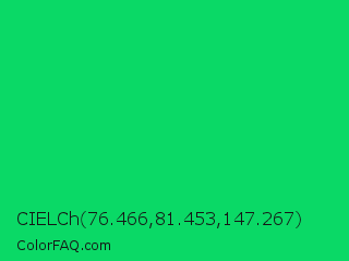 CIELCh 76.466,81.453,147.267 Color is a normal green color and the nearest color is Malachite #0bda51. Hex code #0ad966 and RGB value is rgb(10,217,102). In RGB color space, this color is composed of 4% red, 85% green, 40% blue, In CMYK color space, this color is composed of 95% cyan, 0% magenta, 53% yellow , 15% black , In HSL color space, this color has a hue angle of 147° , 91% saturation and 45% lightness.
