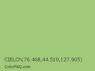 CIELCh 76.468,44.519,127.905 Color is a light green color and the nearest color is Pistachio #93c572. Hex code #a0c97a and RGB value is rgb(160,201,122). In RGB color space, this color is composed of 63% red, 79% green, 48% blue, In CMYK color space, this color is composed of 20% cyan, 0% magenta, 39% yellow , 21% black , In HSL color space, this color has a hue angle of 91° , 42% saturation and 63% lightness.