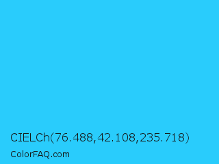 CIELCh 76.488,42.108,235.718 Color is a normal blue color and the nearest color is Spiro Disco Ball #0fc0fc. Hex code #29ccfc and RGB value is rgb(41,204,252). In RGB color space, this color is composed of 16% red, 80% green, 99% blue, In CMYK color space, this color is composed of 84% cyan, 19% magenta, 0% yellow , 1% black , In HSL color space, this color has a hue angle of 194° , 97% saturation and 57% lightness.