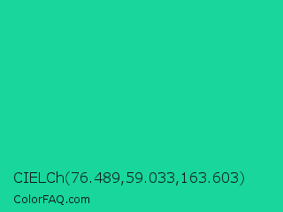 CIELCh 76.489,59.033,163.603 Color is a normal green color and the nearest color is Caribbean Green #00cc99. Hex code #18d69c and RGB value is rgb(24,214,156). In RGB color space, this color is composed of 9% red, 84% green, 61% blue, In CMYK color space, this color is composed of 89% cyan, 0% magenta, 27% yellow , 16% black , In HSL color space, this color has a hue angle of 162° , 80% saturation and 47% lightness.