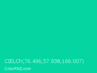 CIELCh 76.496,57.938,166.007 Color is a normal cyan color and the nearest color is Caribbean Green #00cc99. Hex code #05d6a1 and RGB value is rgb(5,214,161). In RGB color space, this color is composed of 2% red, 84% green, 63% blue, In CMYK color space, this color is composed of 98% cyan, 0% magenta, 25% yellow , 16% black , In HSL color space, this color has a hue angle of 165° , 95% saturation and 43% lightness.
