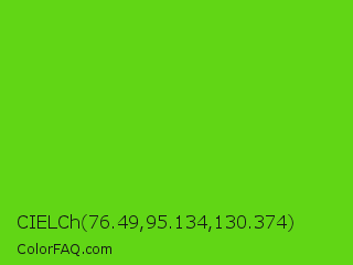 CIELCh 76.49,95.134,130.374 Color is a normal green color and the nearest color is Harlequin Green #46cb18. Hex code #61d615 and RGB value is rgb(97,214,21). In RGB color space, this color is composed of 38% red, 84% green, 8% blue, In CMYK color space, this color is composed of 55% cyan, 0% magenta, 90% yellow , 16% black , In HSL color space, this color has a hue angle of 96° , 82% saturation and 46% lightness.