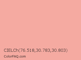 CIELCh 76.518,30.783,30.803 Color is a light red color and the nearest color is Rose Bud #fbb2a3. Hex code #f5aaa1 and RGB value is rgb(245,170,161). In RGB color space, this color is composed of 96% red, 67% green, 63% blue, In CMYK color space, this color is composed of 0% cyan, 31% magenta, 34% yellow , 4% black , In HSL color space, this color has a hue angle of 6° , 81% saturation and 80% lightness.