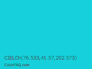 CIELCh 76.533,41.57,202.573 Color is a normal cyan color and the nearest color is Dark Turquoise #00ced1. Hex code #14d1d9 and RGB value is rgb(20,209,217). In RGB color space, this color is composed of 8% red, 82% green, 85% blue, In CMYK color space, this color is composed of 91% cyan, 4% magenta, 0% yellow , 15% black , In HSL color space, this color has a hue angle of 182° , 83% saturation and 46% lightness.