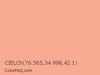 CIELCh 76.565,34.998,42.1 Color is a light red color and the nearest color is Mona Lisa #ffa194. Hex code #f8aa93 and RGB value is rgb(248,170,147). In RGB color space, this color is composed of 97% red, 67% green, 58% blue, In CMYK color space, this color is composed of 0% cyan, 31% magenta, 41% yellow , 3% black , In HSL color space, this color has a hue angle of 14° , 88% saturation and 77% lightness.
