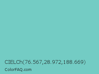 CIELCh 76.567,28.972,188.669 Color is a light cyan color and the nearest color is Downy #6fd0c5. Hex code #73ccc4 and RGB value is rgb(115,204,196). In RGB color space, this color is composed of 45% red, 80% green, 77% blue, In CMYK color space, this color is composed of 44% cyan, 0% magenta, 4% yellow , 20% black , In HSL color space, this color has a hue angle of 175° , 47% saturation and 63% lightness.