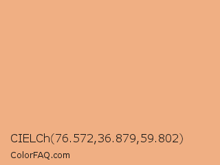 CIELCh 76.572,36.879,59.802 Color is a light orange color and the nearest color is Tacao #edb381. Hex code #f0af83 and RGB value is rgb(240,175,131). In RGB color space, this color is composed of 94% red, 69% green, 51% blue, In CMYK color space, this color is composed of 0% cyan, 27% magenta, 45% yellow , 6% black , In HSL color space, this color has a hue angle of 24° , 78% saturation and 73% lightness.