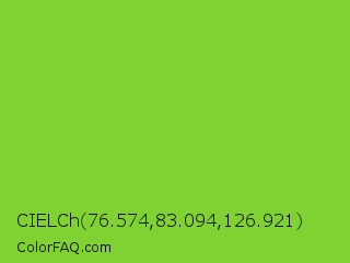 CIELCh 76.574,83.094,126.921 Color is a normal green color and the nearest color is Atlantis #97cd2d. Hex code #7fd231 and RGB value is rgb(127,210,49). In RGB color space, this color is composed of 50% red, 82% green, 19% blue, In CMYK color space, this color is composed of 40% cyan, 0% magenta, 77% yellow , 18% black , In HSL color space, this color has a hue angle of 91° , 64% saturation and 51% lightness.