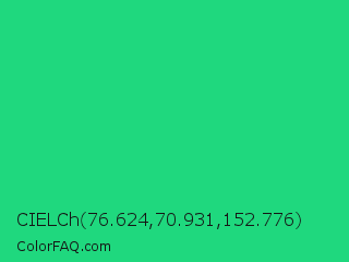CIELCh 76.624,70.931,152.776 Color is a normal green color and the nearest color is UFO Green #3cd070. Hex code #1fd87e and RGB value is rgb(31,216,126). In RGB color space, this color is composed of 12% red, 85% green, 49% blue, In CMYK color space, this color is composed of 86% cyan, 0% magenta, 42% yellow , 15% black , In HSL color space, this color has a hue angle of 151° , 75% saturation and 48% lightness.