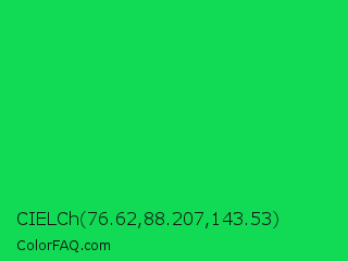 CIELCh 76.62,88.207,143.53 Color is a normal green color and the nearest color is Malachite #0bda51. Hex code #11da54 and RGB value is rgb(17,218,84). In RGB color space, this color is composed of 7% red, 85% green, 33% blue, In CMYK color space, this color is composed of 92% cyan, 0% magenta, 61% yellow , 15% black , In HSL color space, this color has a hue angle of 140° , 86% saturation and 46% lightness.
