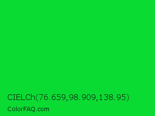 CIELCh 76.659,98.909,138.95 Color is a normal green color and the nearest color is Vivid Malachite #00cc33. Hex code #0adb33 and RGB value is rgb(10,219,51). In RGB color space, this color is composed of 4% red, 86% green, 20% blue, In CMYK color space, this color is composed of 95% cyan, 0% magenta, 77% yellow , 14% black , In HSL color space, this color has a hue angle of 132° , 91% saturation and 45% lightness.